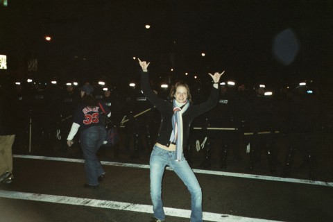 *On the picture: not one of my brightest moments. This is when the Red Sox won the World Series in 2004. I was a freshman at the time and the whole campus was watching the game (if you’re not familiar, it’d been since like 1918 that they’d won. The whole Curse of the Bambino thing. It was a HUGE DEAL in the area at the time. I mean fans were sweating, peeing their pants, the whole nine yards. So anyway, they win, and my friend Karen is like LET’S DRIVE INTO THE CITY. So we did. Insane crowds, dancing, drinking… it was all going down in Boston that night. Looking back it was fun and crazy but like standing in front of the cops in full riot gear in a semi squat with my stupid hang-ten hands? Dumb, Bridget. I don’t think an INFP would do THAT now.